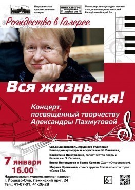 7 января 2020г. в 16:00 в Национальной художественной галерее состоится концерт, посвященный творчеству Александры Пахмутовой, «Вся жизнь – песня!»